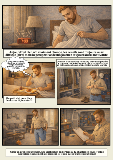 Ainsi chaque matin, quand je me prépare je pense à la journée qui m'attend tout en répondant méthodiquement à la routine que je me suis fixé : Petit dej, échauffement, re-lecture du bordereau de chantier, charger le camion et c'est partie !